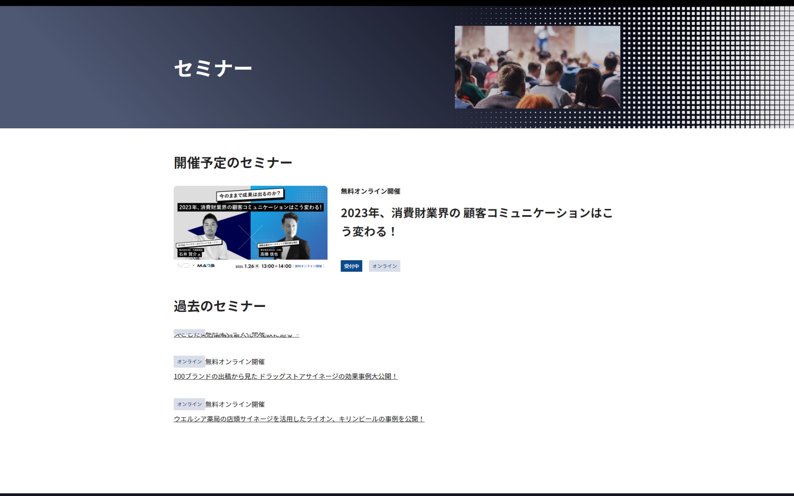 リード獲得を目的としたセミナーページは、セミナー終了後は自動的に応募ページを非表示にするといった機能も装備いたしました。