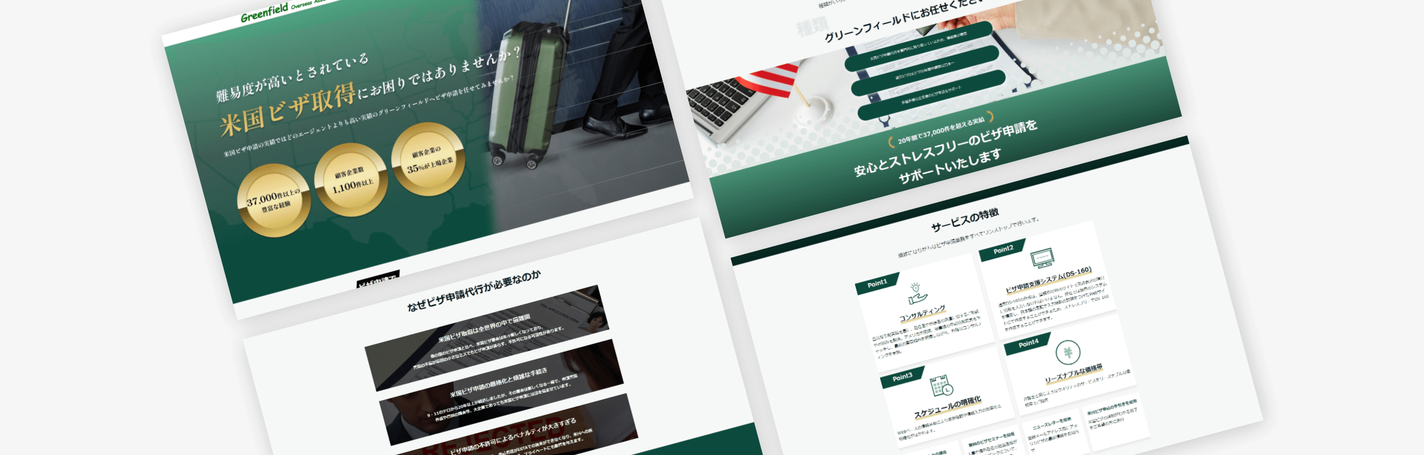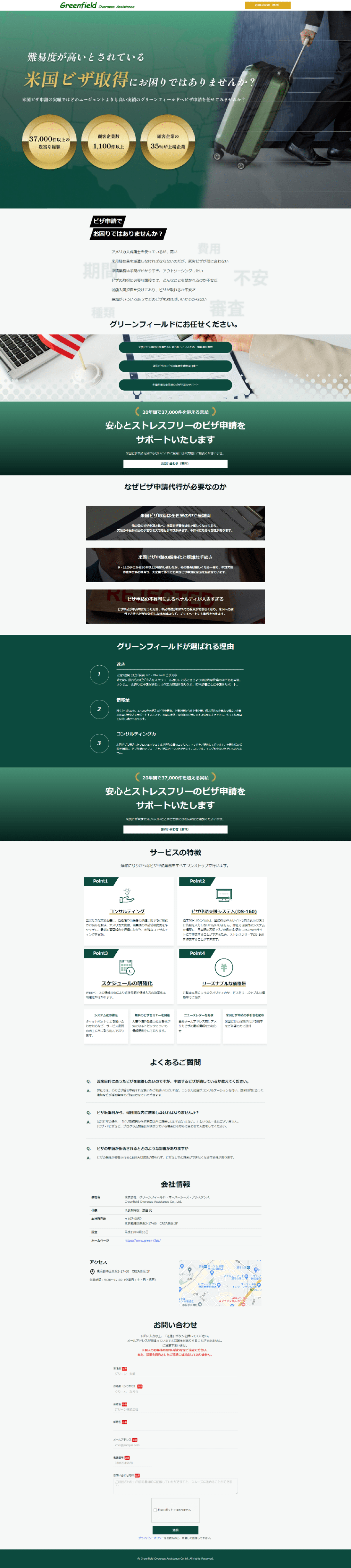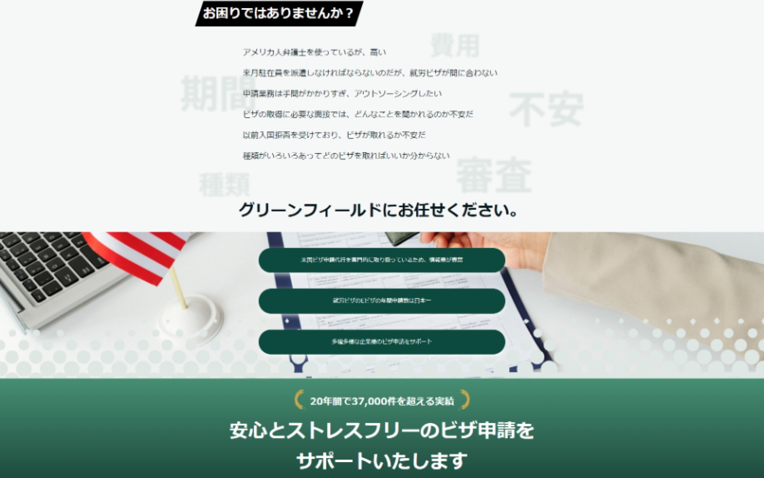 https://landing.green-f.biz/「株式会社グリーンフィールド・オーバーシーズ・アシスタンス」は、企業の米国ビザ申請代行のトータルサポートを行っている会社です。米国ビザの取得は厳格化が進んでおり、一度取得に失敗すると再申請の手続きに手間と時間がかかることから、企業としては、米国ビザの取得失敗はリスクとなります。クライアント様は複数の大企業をはじめとした、多くの企業の米国ビザ取得代行を請け負っています。この度、広告用のランディングページの制作にあたり、NERDにご依頼をいただきました。