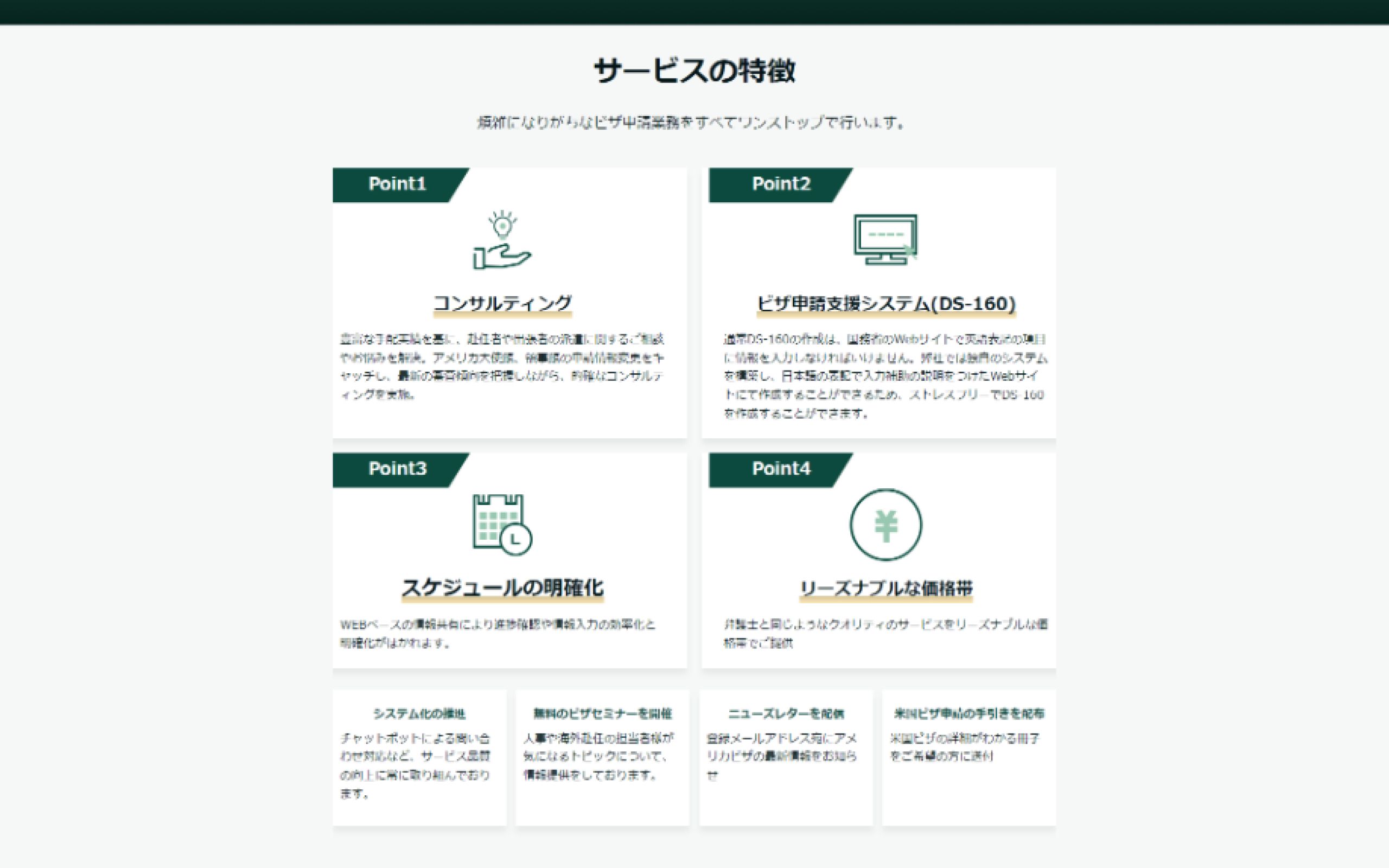 クライアント様は1,000件を超える企業の米国ビザ取得代行を請け負っているという実績をお持ちであったため、実績を前面に出す形にしました。また、LPのターゲットが企業であるため、ターゲットに即したスマートなデザインとしました。