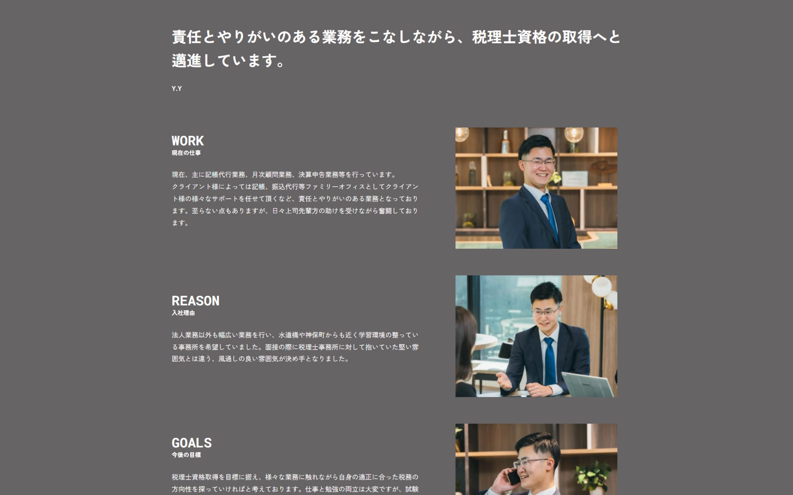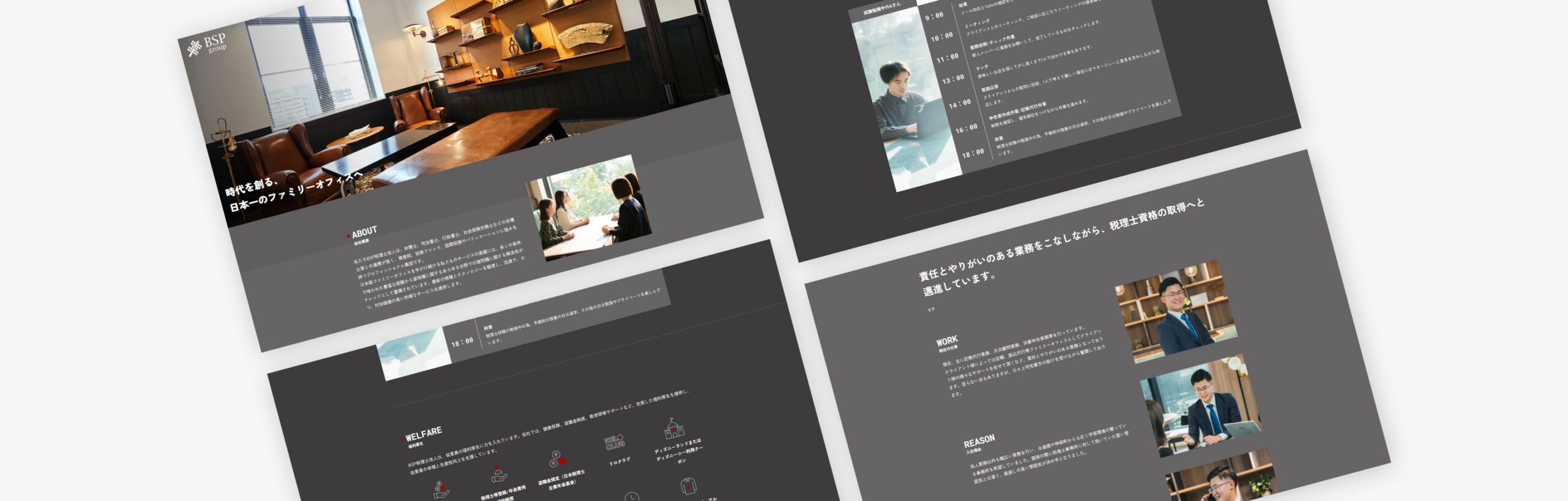 クライアント様は既にコーポレートサイトを制作・運営されていますが、採用活動を見据えた際に、「BSP税理士法人」がどういう会社かといった情報が足りないこと、またコーポレートサイトを編集できないことに課題感を持たれていました。そこで、採用を見据えた、会社紹介用のwebサイトを制作したいとご相談をいただきました。