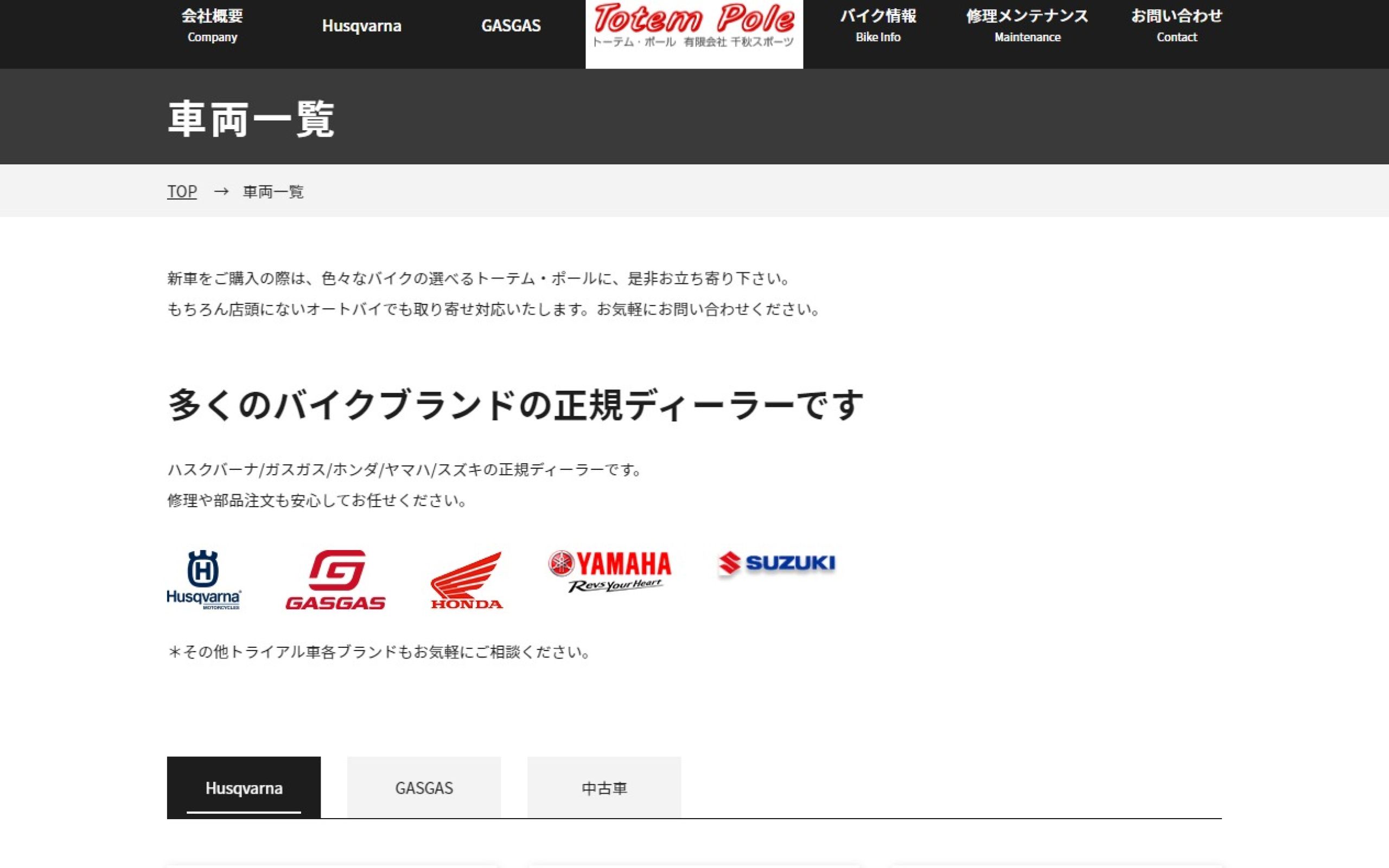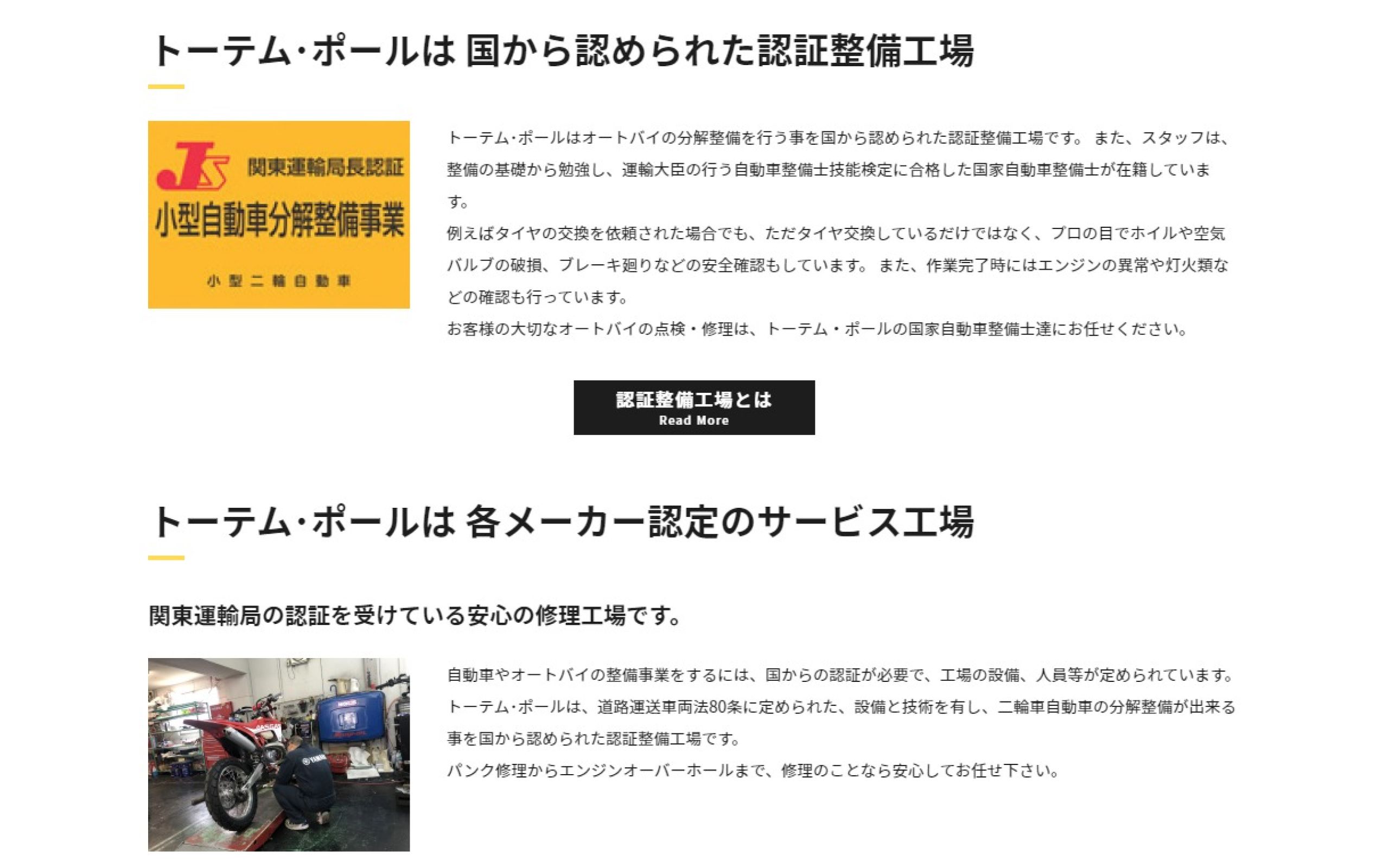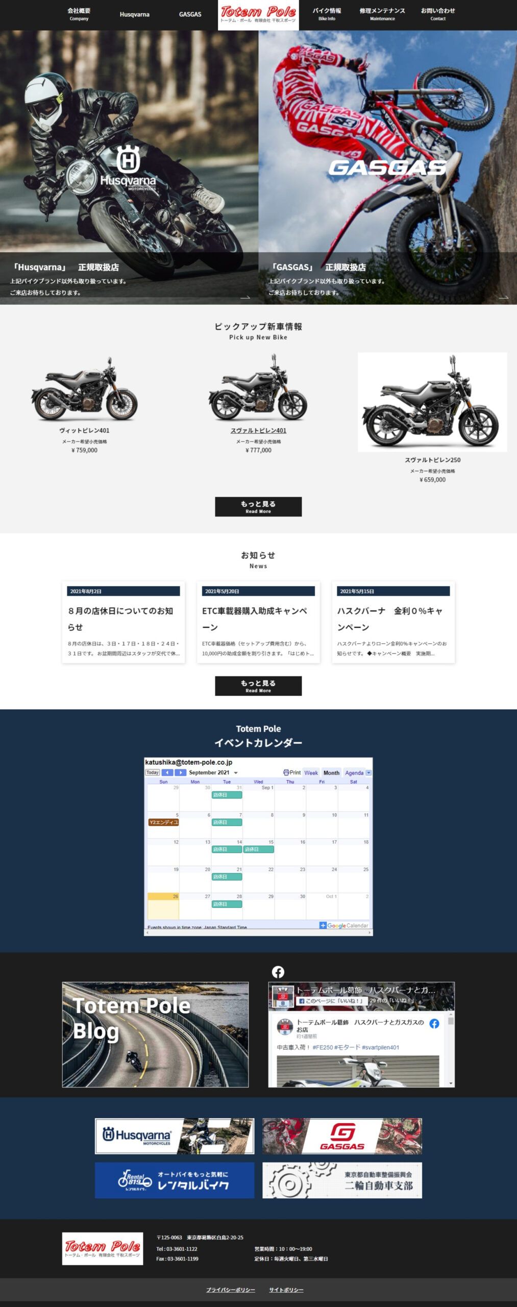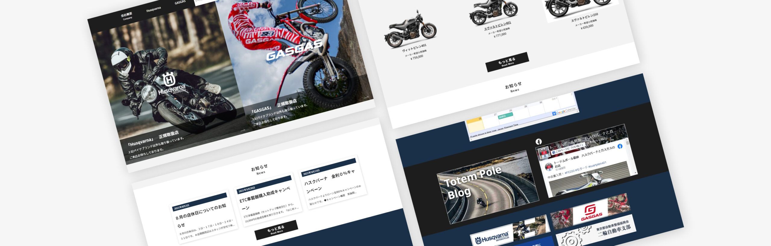 https://totem-pole.co.jp/東京・葛飾にかまえるバイク販売店「トーテム・ポール葛飾」様の店舗ホームページ制作の事例です。こちらのお店ではバイクの新車・中古車販売や修理サービスなどを提供されており、今回は店舗ホームページリニューアルのご依頼をいただきました。情報の更新が極力しやすいサイトをご提案させていただいております。今後もぜひご活用いただければ幸いです。