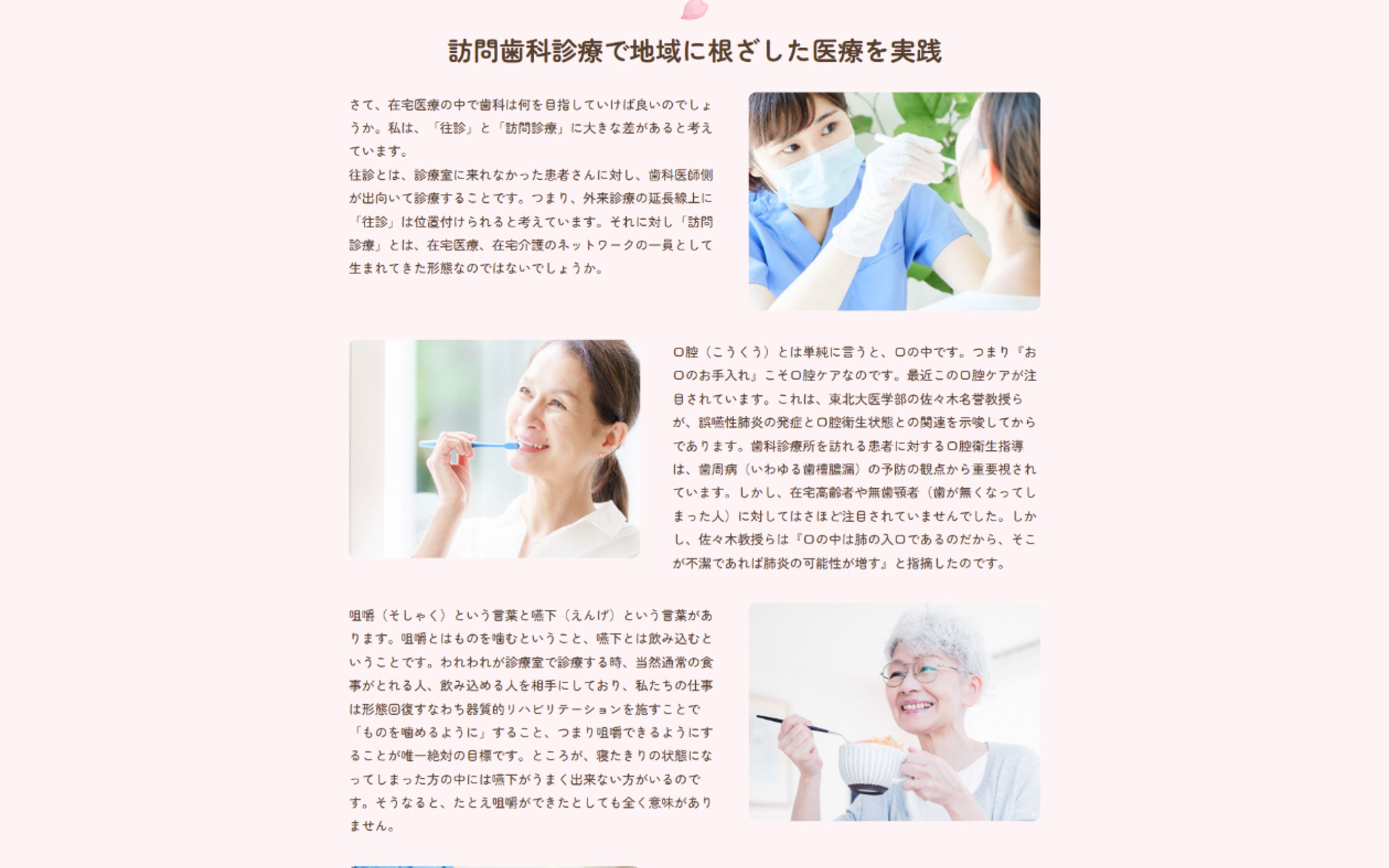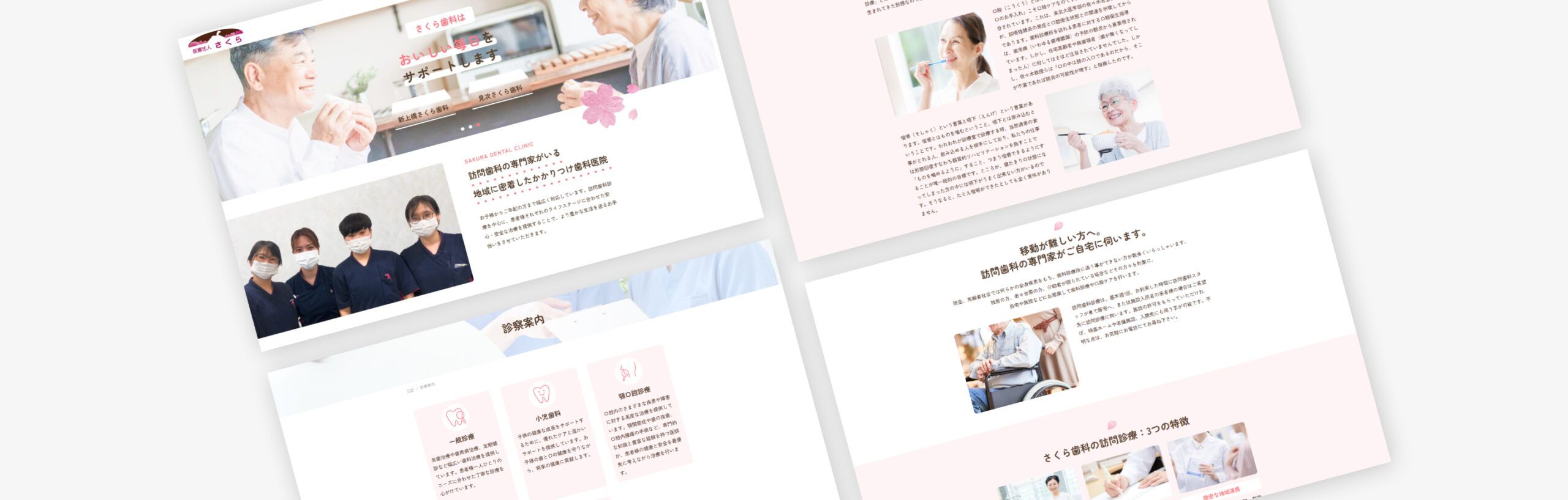 サイトイメージについて、ご要望の柔らかいイメージを表現するため、ピンクを使用したサイトデザインにしました。フォントについても柔らかいフォントを起用しました。また、「医療法人さくら」の利用者の年齢層が幅広いというお話を受けて、フォントは大き目のものを採用しました。