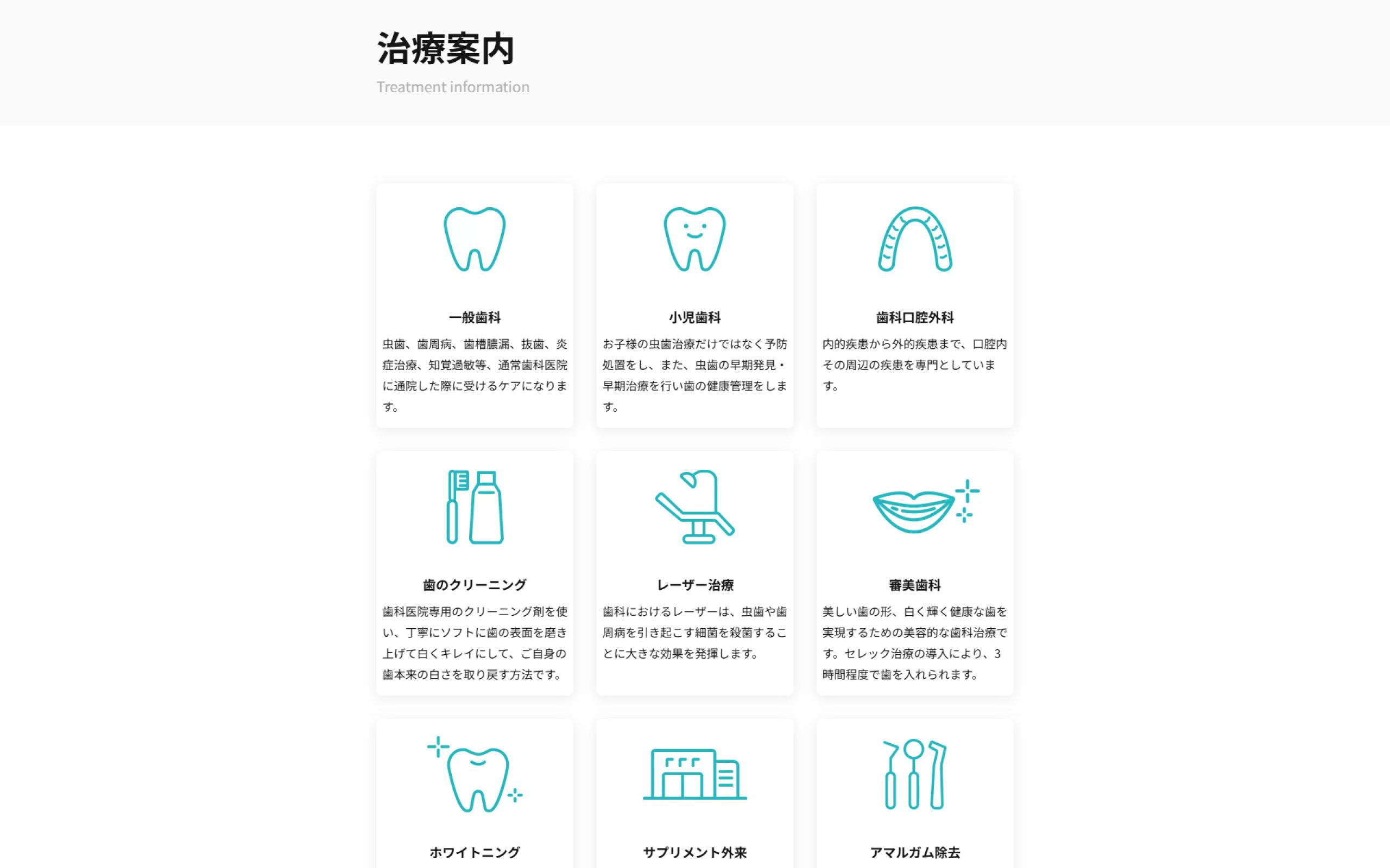 また、「どのような情報をサイトに掲載したら良いか分からない」という、クライアント様の課題については、NERDは歯科医のwebサイト制作実績が多数あるため、他院で掲載されている掲載内容をベースにしてサイトを制作しました。制作過程で先生よりフィードバックをいただき、目線を合わせて必要な修正を行い、サイトのブラッシュアップを行うことで、クライアント様に合った掲載内容にカスタマイズをしていきました。